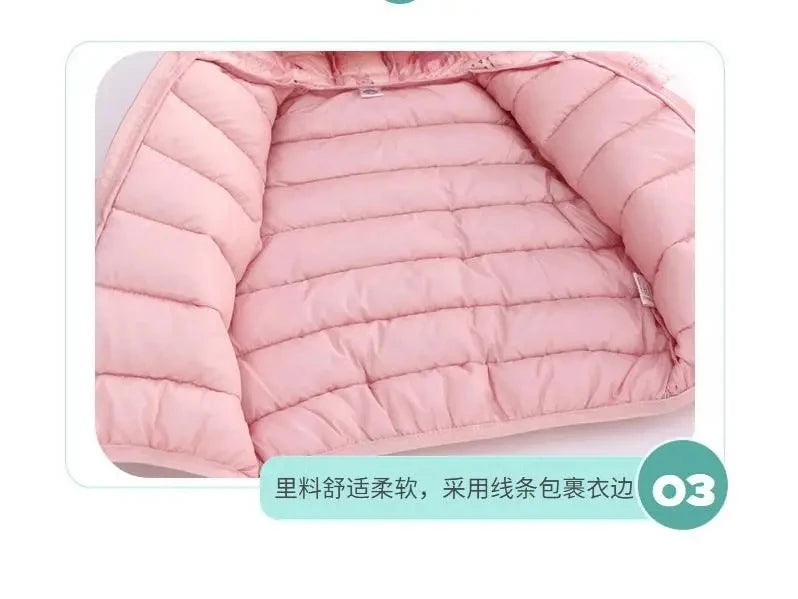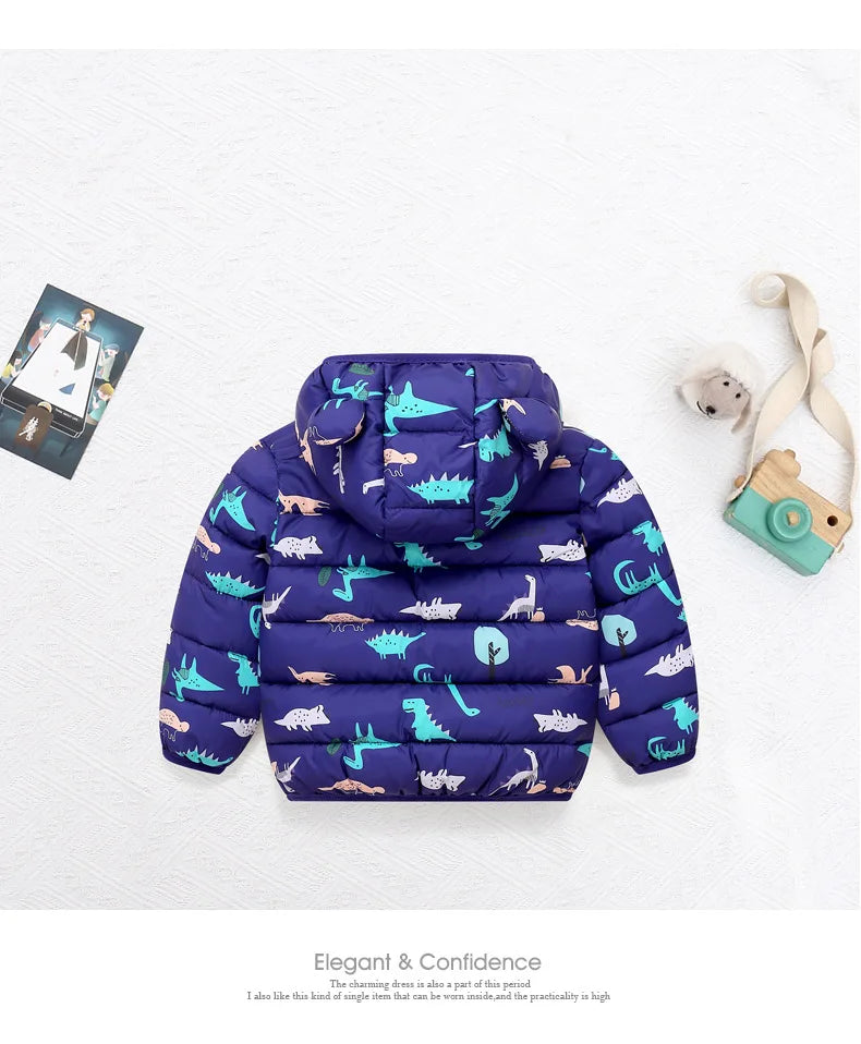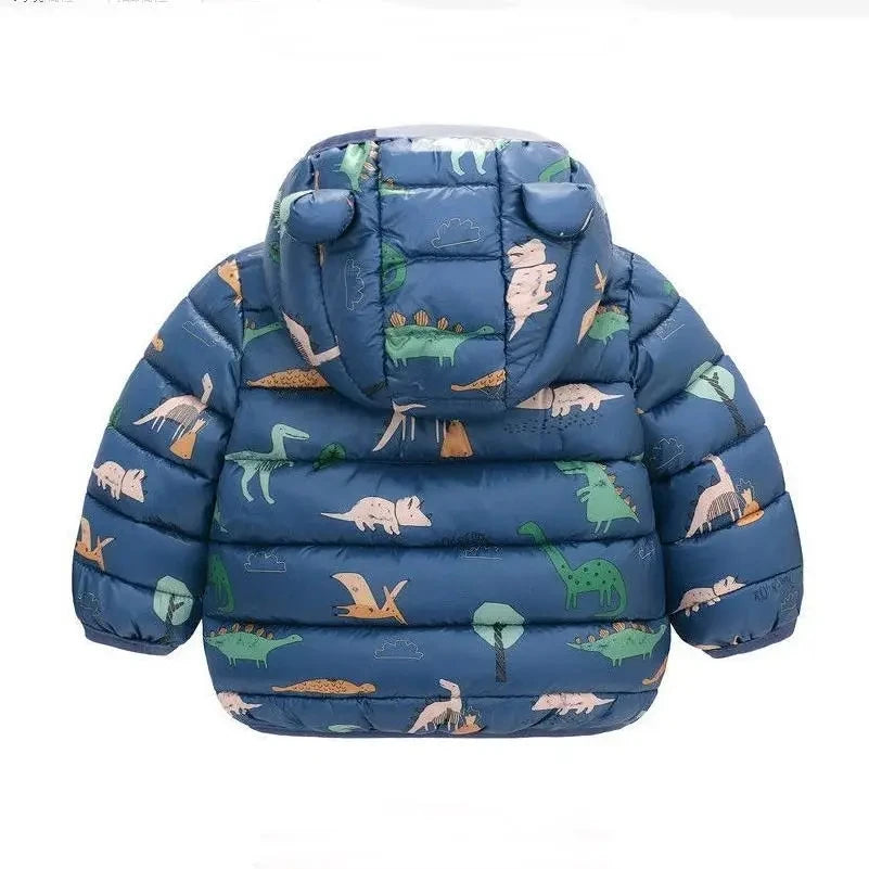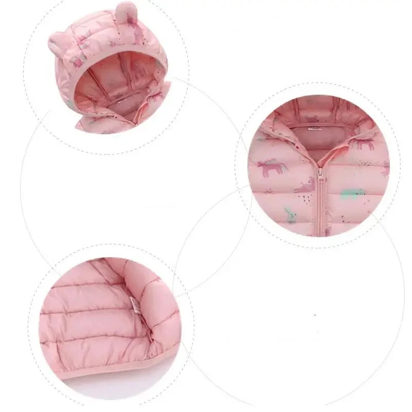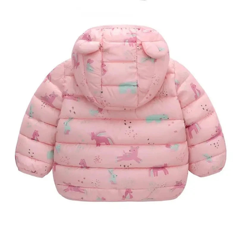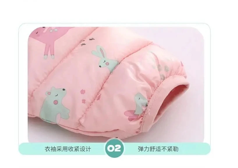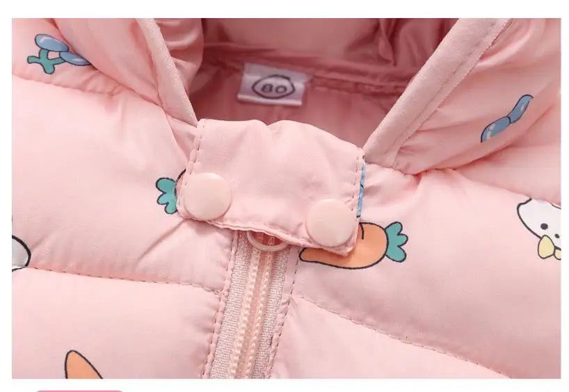 Casaco de algodão infantil com desenhos animados para bebês, jaqueta de penas com capuz para meninos e meninas, roupas quentes de inverno para crianças de 0 a 5 anos